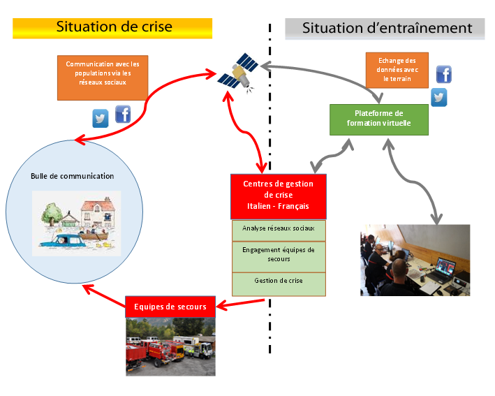 Des interfaces permettant de créer une chaîne d’information entre le terrain et les salles de gestion de crise ont été développées afin d’interagir avec le public via les réseaux sociaux pour lui délivrer des consignes et pour intégrer des renseignements pouvant être utiles à la gestion des événements. Il s’est agit de coupler des outils de transmission satellite avec, d’une part, des systèmes d’analyse et de supervision des médias sociaux utilisables en situation de crise, et d’autre part, une plateforme de réalité virtuelle permettant d’entraîner les équipes décisionnelles de façon extrêmement réaliste et performante.